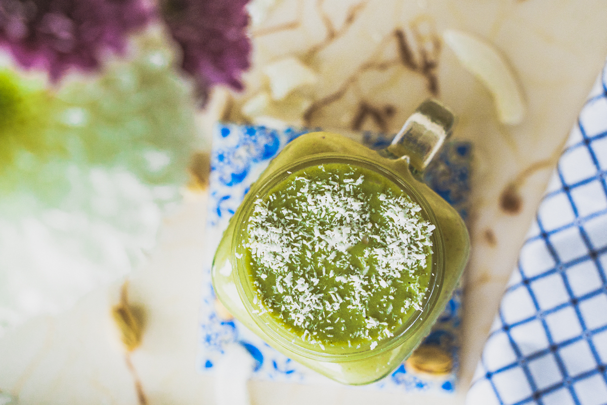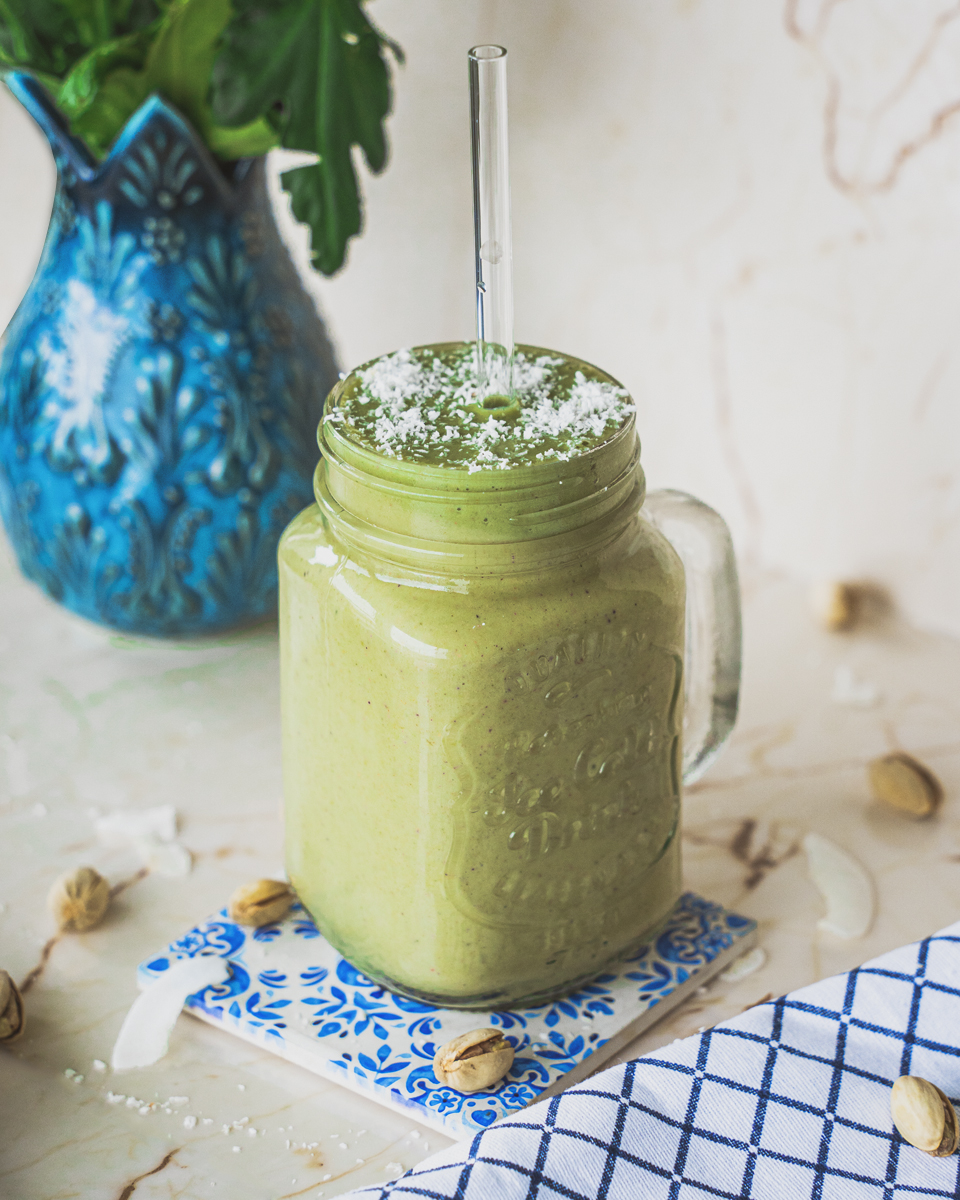 Creamy and gently refreshing, this green shake combines avocado, banana, and pistachio in a velvety texture, enhanced with hemp protein for balanced nutrition. Rice-coconut drink and coconut paste add delicate sweetness and exotic flavor, while a final sprinkling of coconut flakes makes it a real treat in a glass.