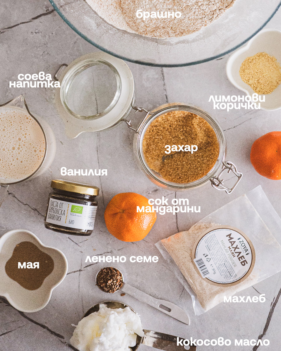 В голяма купа смесете брашното, останалата захар, махлеба и лимоновите корички. Добавете активираната мая, лененото „яйце“, сока от мандарини (или портокал), разтопеното кокосово масло и ванилията. Замесете меко и еластично тесто.