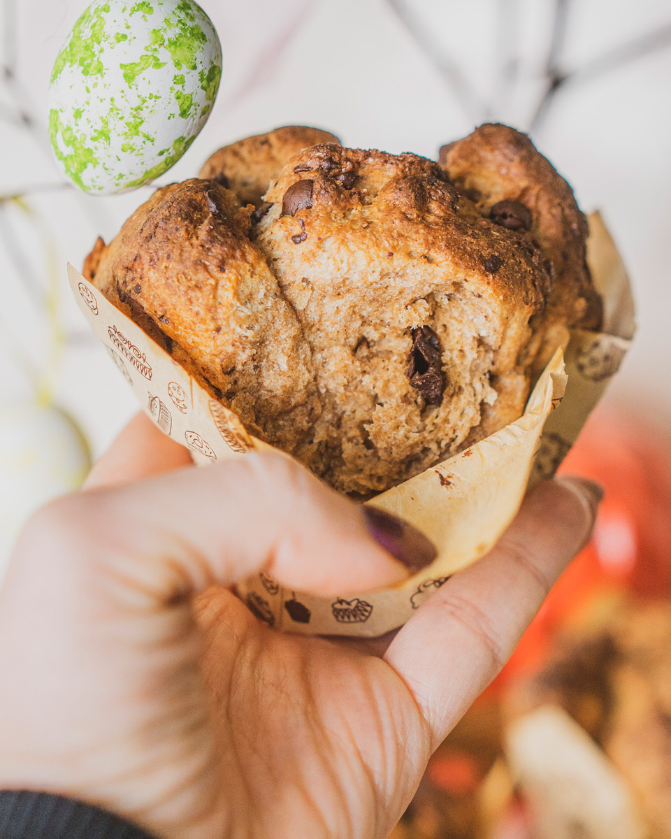 Inspired by traditional Easter sweet bread, these vegan chocolate sweet bread muffins bring all the festive flavor in a more modern, individual form. Soft, fluffy and beautifully aromatic, they are infused with citrus, vanilla and mahleb – the signature spice that gives this type of dough its unique and irresistible character. The addition of chocolate pieces makes every bite even more indulgent. Perfect for sharing during Easter or enjoying as a cozy homemade treat.