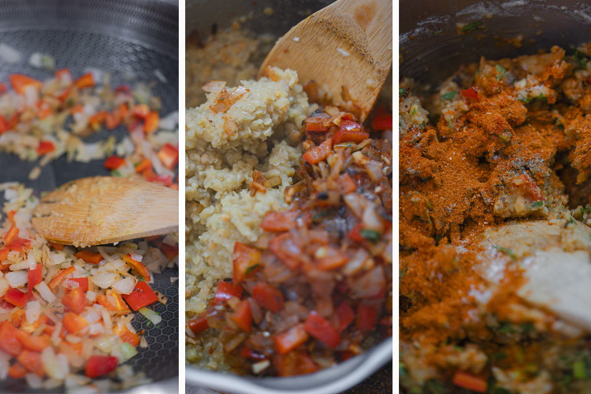 While the lentil mixture rests, finely chop the onion, garlic, and bell pepper. Sauté them in a pan with a little oil until soft and fragrant, then add the tomato paste and cook for another minute.