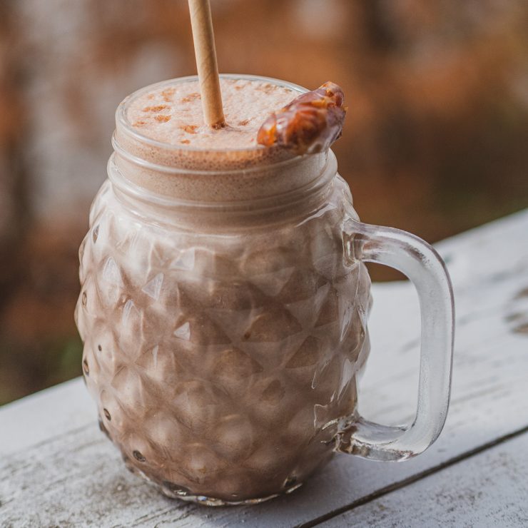 Creamy, deeply chocolatey, and naturally sweetened, this shake is a real hug in a glass. Hazelnut tahini and cocoa give it a rich flavor, dates add caramel sweetness, and baobab and almond protein make it a balanced and filling choice – perfect for breakfast, after a workout, or as an energizing break during the day.