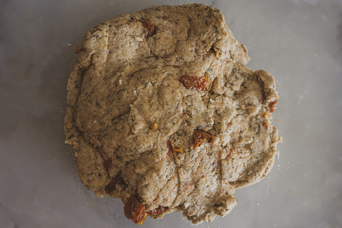 In a bowl, combine all ingredients except the sun-dried tomatoes and mix until a smooth dough forms.