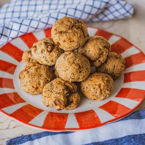 This week, we offer you our autumn savory vegan balls with cheese and sun-dried tomatoes – golden, aromatic, and designed to bring comfort on cold days. Made with whole grain and almond flour, seasoned with Italian herbs and garlic, they hide a delicately melting vegan center. Each bite is a little autumn delight – warm, fragrant, and completely plant-based.
